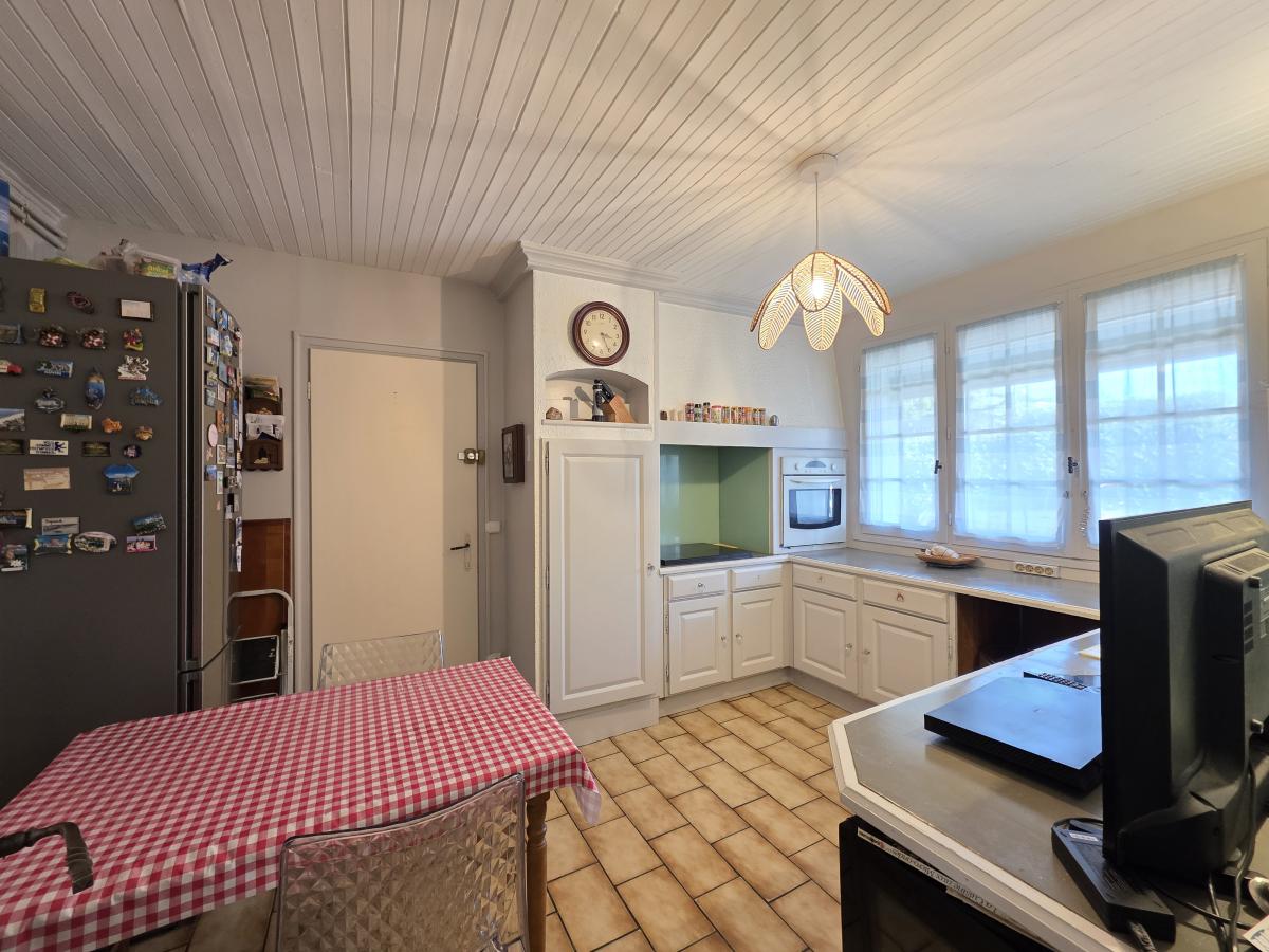 La maison d'environ 99 m² se compose d’un hall d’entrée avec placard, desservant une cuisine indépendante avec accès direct au garage et à son cellier de 10 m², lequel ouvre également sur le jardin.